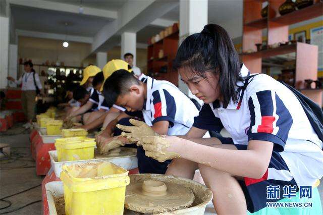7月16日,一群学生在花茂村体验手工制陶。新华网 周远钢 摄