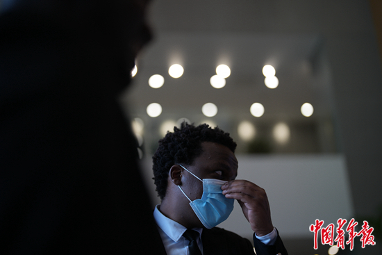 7月21日,北京,世界青年发展论坛开幕式结束后,一名外国青年代表在茶歇期间调整口罩。中青报·中青网记者 李隽辉/摄