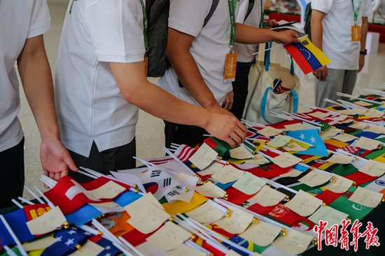 7月21日,北京,世界青年发展论坛开幕式前,志愿者们在整理将要发给各国参会代表的国旗。为了便于分辨,每面国旗上都贴着写有该国名称的记事贴。中青报·中青网记者 赵迪/摄