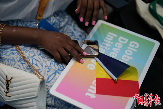 7月21日,北京,世界青年发展论坛开幕式上,一名来自乍得共和国的青年代表手拿国旗和印有大会标志的手牌。中青报·中青网记者 李隽辉/摄