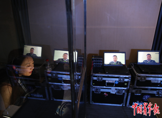 7月21日,北京,世界青年发展论坛全体会议上,翻译人员在对埃及青年事务与体育部部长阿什拉夫·苏布希的发言进行同声传译。中青报·中青网记者 陈剑/摄