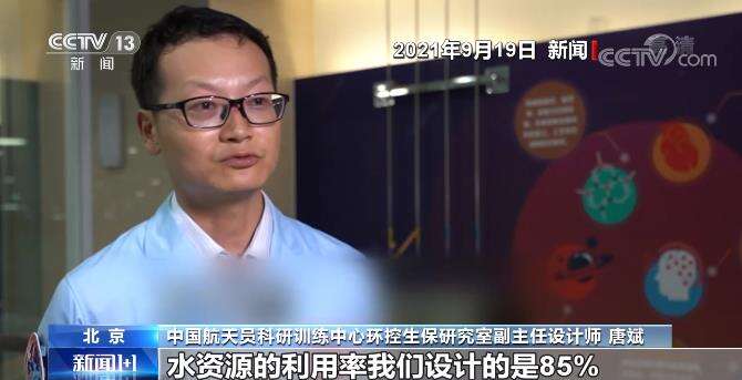 中国航天员科研训练中心环控生保研究室副主任设计师 唐斌:水资源的利用率我们设计的是85%,现在是完全满足我们的设计指标,到后面现在一直使用的是再生水,对舱内的气体净化也不需要消耗一些消耗品,它都是一个循环利用的过程,这样就能够保证长期的一个载人飞行任务。