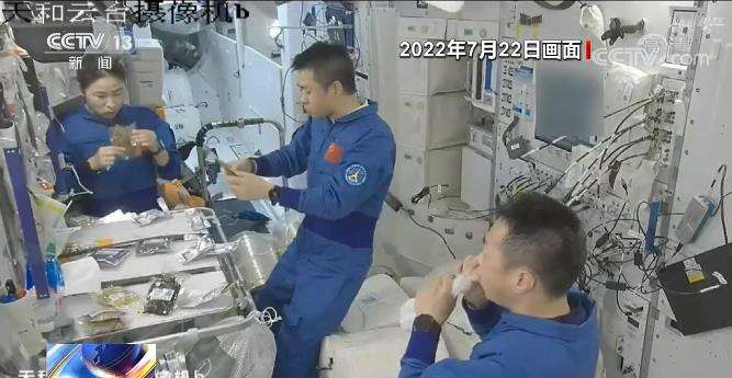 这是三名航天员今天吃早饭的画面,正对着我们的是女航天员刘洋,最中间的是航天员陈冬,背对着镜头的是航天员蔡旭哲。
