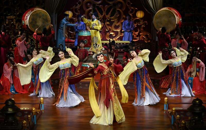 在西安大唐芙蓉园拍摄的融合了大唐乐舞和东仓鼓乐创新而成的舞台剧《鼓》。 新华社记者 刘潇 摄