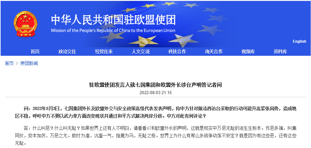 问:2022年8月3日,七国集团外长及欧盟外交与安全政策高级代表发表声明,称中方针对佩洛西访台采取的行动可能升高紧张局势,造成地区不稳,呼吁中方不要以武力单方面改变现状并通过和平方式解决两岸分歧。中方对此有何评论?