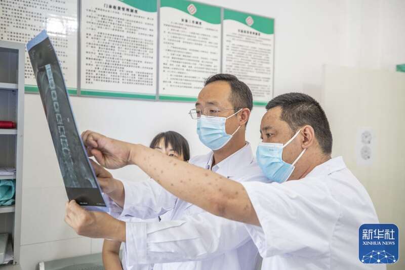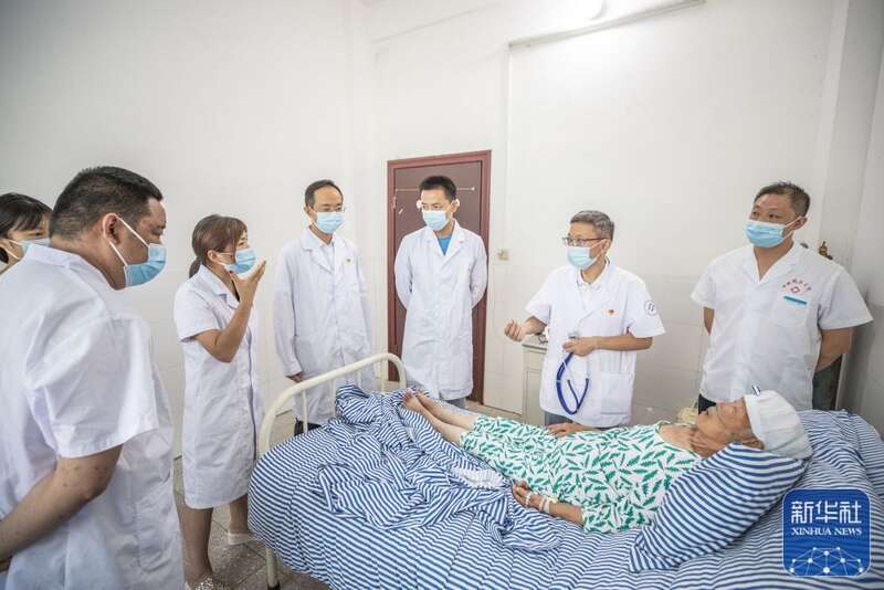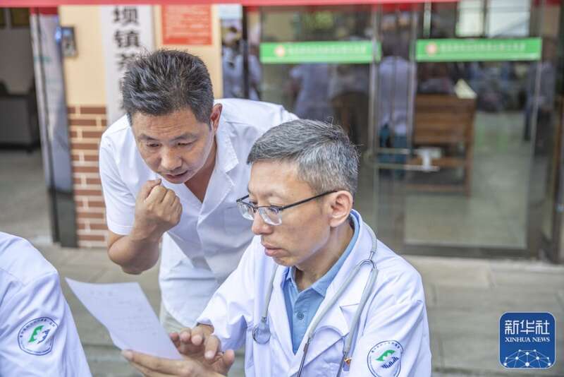 8月11日,在重庆市巫溪县田坝镇卫生院,在田坝镇担任驻村第一书记的蒋在强(右二)、代涛(右三)、廖正步(右四)和卫生院医生一起探讨优化治疗方案。新华社记者 黄伟 摄