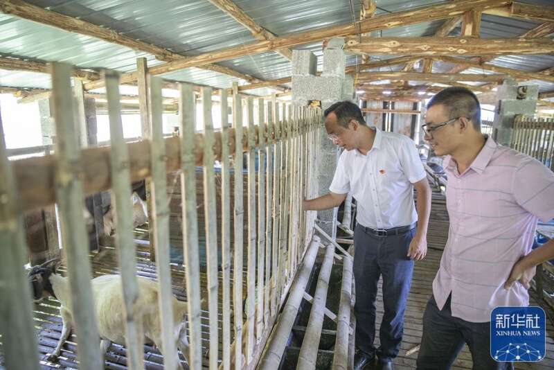 8月11日,在重庆市巫溪县田坝镇双箭村,驻村第一书记廖正步(左)和驻村队员在查看牲畜养殖情况。新华社记者 黄伟 摄