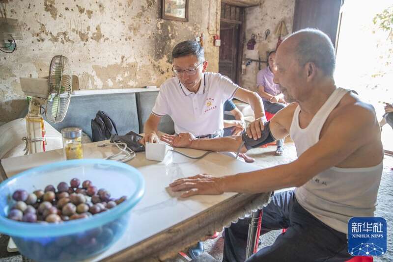 8月11日,在重庆市巫溪县田坝镇田坝村,驻村第一书记蒋在强(左)在入户走访时为村民做健康监测。新华社记者 黄伟 摄