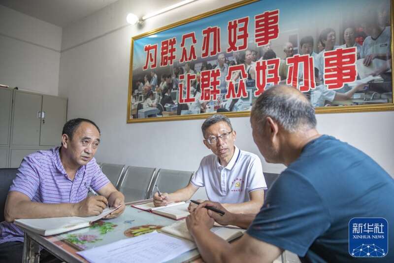 8月11日,在重庆市巫溪县田坝镇田坝村,驻村第一书记蒋在强(中)和村工作人员一起讨论需要解决的民生问题。新华社记者 黄伟 摄
