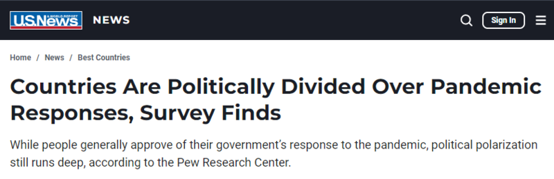 中国日报网8月15日电 据《美国新闻与世界报道》网站报道,美国皮尤研究中心(Pew Research Center)11日公布的一项最新民调数据显示,通过对世界19个发达经济体的2万余名受访者的调查发现,在应对新冠疫情的问题上,民众间存在严重的党派分歧,政治两极分化仍然根深蒂固。