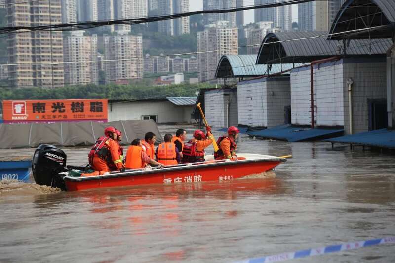 2020年8月,消防员在菜园坝水果市场转移搜救被困人员。