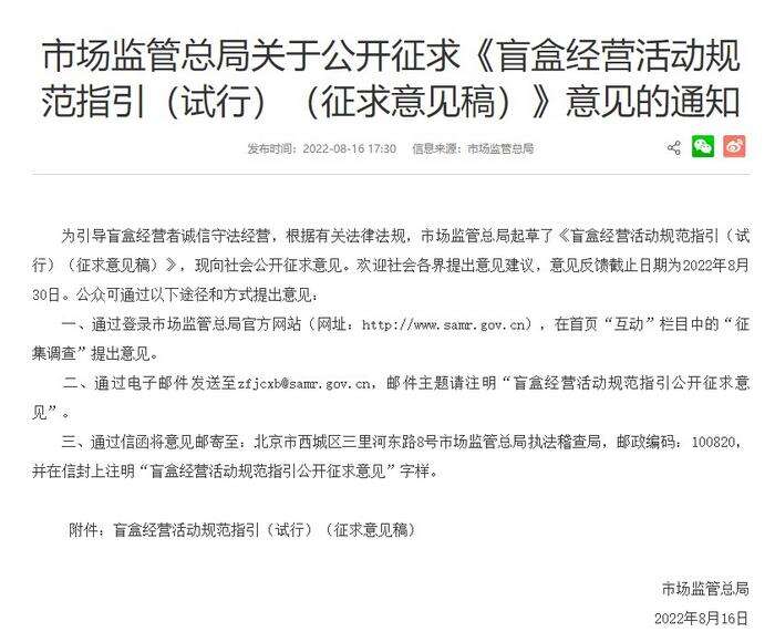 16日,市场监管总局公开征求《盲盒经营活动规范指引(试行)(征求意见稿)》意见,拟对盲盒销售的内容、形式、销售对象等方面作出规定。