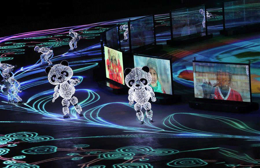 △“北京8分钟”,智能机器人控制着“冰屏”与24名轮滑演员,配合地面投影不断变幻曼妙舞姿。