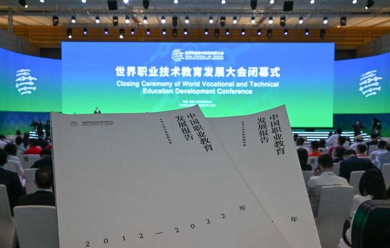 这是在天津举行的首届世界职业技术教育发展大会闭幕式上拍摄的《中国职业教育发展白皮书》。 新华社记者 孙凡越 摄