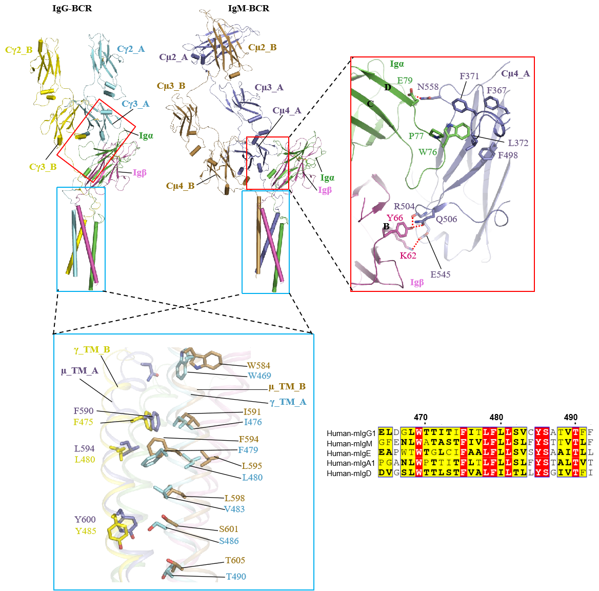 人类B细胞受体有5种亚型,在该研究中,该课题组解析了人IgG和IgM两种亚型的BCR复合物结构,BCR复合物结构包含了一个膜结合形式的免疫球蛋白(mIg)同源二聚体,用于识别抗原,以及一个膜结合形式的Igα/β(CD79α/CD79β)异二聚体,用于信号传递(化学计量比为1:1)。其中,mIg二聚体包含了Fab和Fc结构域、连接肽(CPs)和跨膜(TM)螺旋,Igα/β结构由两个胞外Ig样结构域、CPs和TM螺旋组成。IgG和IgM-BCR复合物的组装分别由胞外的IgG-Cγ3和IgM-Cμ4与Igα/β的Ig样结构域,以及连接肽、跨膜螺旋承担。课题组通过两个亚型的结构比较发现,mIgG和mIgM的跨膜螺旋区通过保守的疏水和极性作用与Igα/β 结合。相比之下,在胞外区域,IgG-Cγ3和IgM-Cμ4分别通过“首尾相连”(head-to-tail)以及“肩并肩”(side-by-side)的模式与Igα/β的Ig样结构域结合,其中,Igα的CD loop 旋转了90度,分别与Cγ3和Cμ4结构域结合。结构上观察的不同亚型组装模式是否和活性有关值得进一步研究。