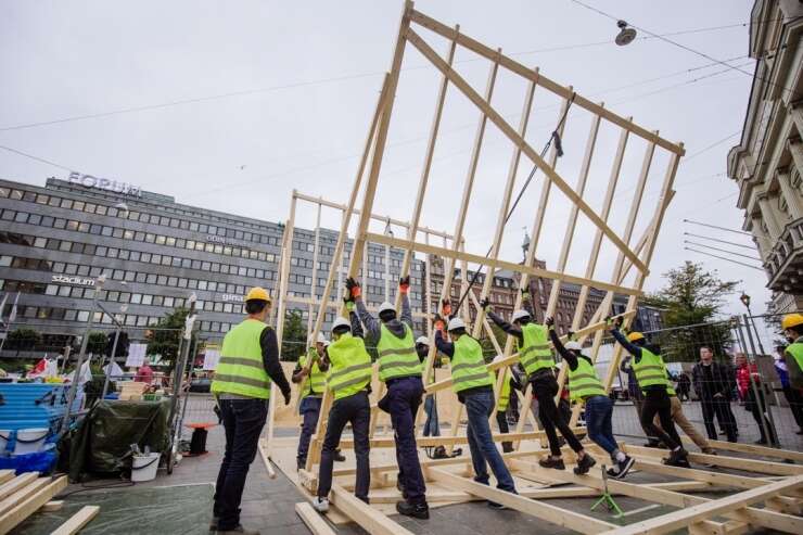 2017年赫尔辛基设计周,谢英俊让难民自己动手盖房子搭建过程。