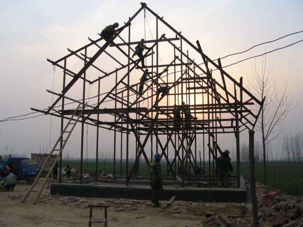 汶川地震后,杨柳村村民在谢英俊的带领下,自己动手重建家园,图为立架过程。