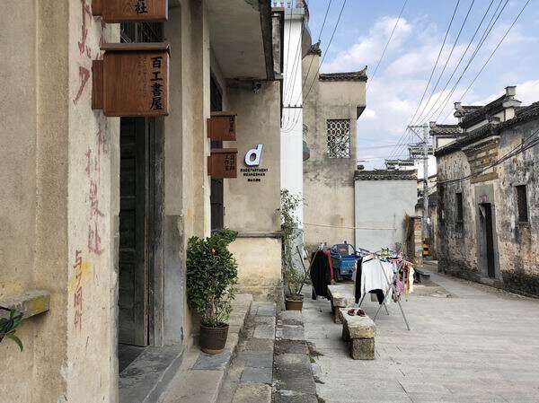 位于碧山工销社外,“D&D黄山店”的招牌以及村民晾晒的衣服构成独特的生活场景。 供图:碧山工销社