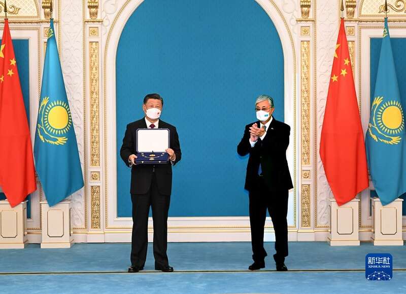 托卡耶夫致授勋辞。托卡耶夫表示,今天,伟大的中国国家主席习近平访问哈萨克斯坦,是哈方的莫大荣幸。习近平主席是一位真正的伟大领袖,得到中国人民的衷心拥护。在习近平主席卓越领导下,中国取得伟大发展成就,消除了绝对贫困,全面建成了小康社会,中华民族伟大复兴进入新征程。相信在习近平主席英明领导下,中国必将如期实现全面建设社会主义现代化国家的宏伟目标。习近平主席提出共建“一带一路”和构建人类命运共同体的伟大倡议,为推动建设新型国际关系作出杰出贡献。习近平主席提出的全球发展倡议和全球安全倡议,对于解决当今世界面临的风险挑战具有重要战略意义。