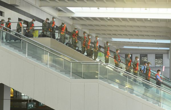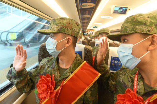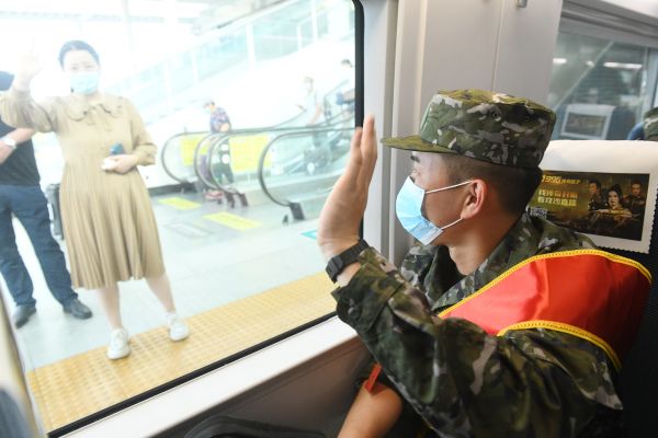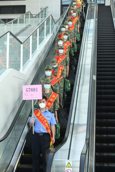 2022年9月16日,安徽省阜阳市,新兵从高铁阜阳西站有序进站上车,奔赴军营。