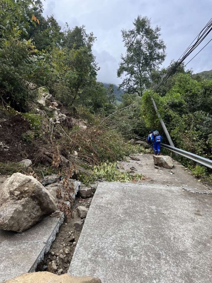 接到搜救任务当天,绵羊蓝天救援队再次连夜赶至石棉县,身负重装备,徒步挺进猛虎岗开展搜援。左队长向天目新闻介绍,搜救队抵达罗永指定的甘宇等待救援位置,他们在现场看到山体山路垮塌严重,山间石崖出现巨大裂缝,那一带山体植被基本塌方。