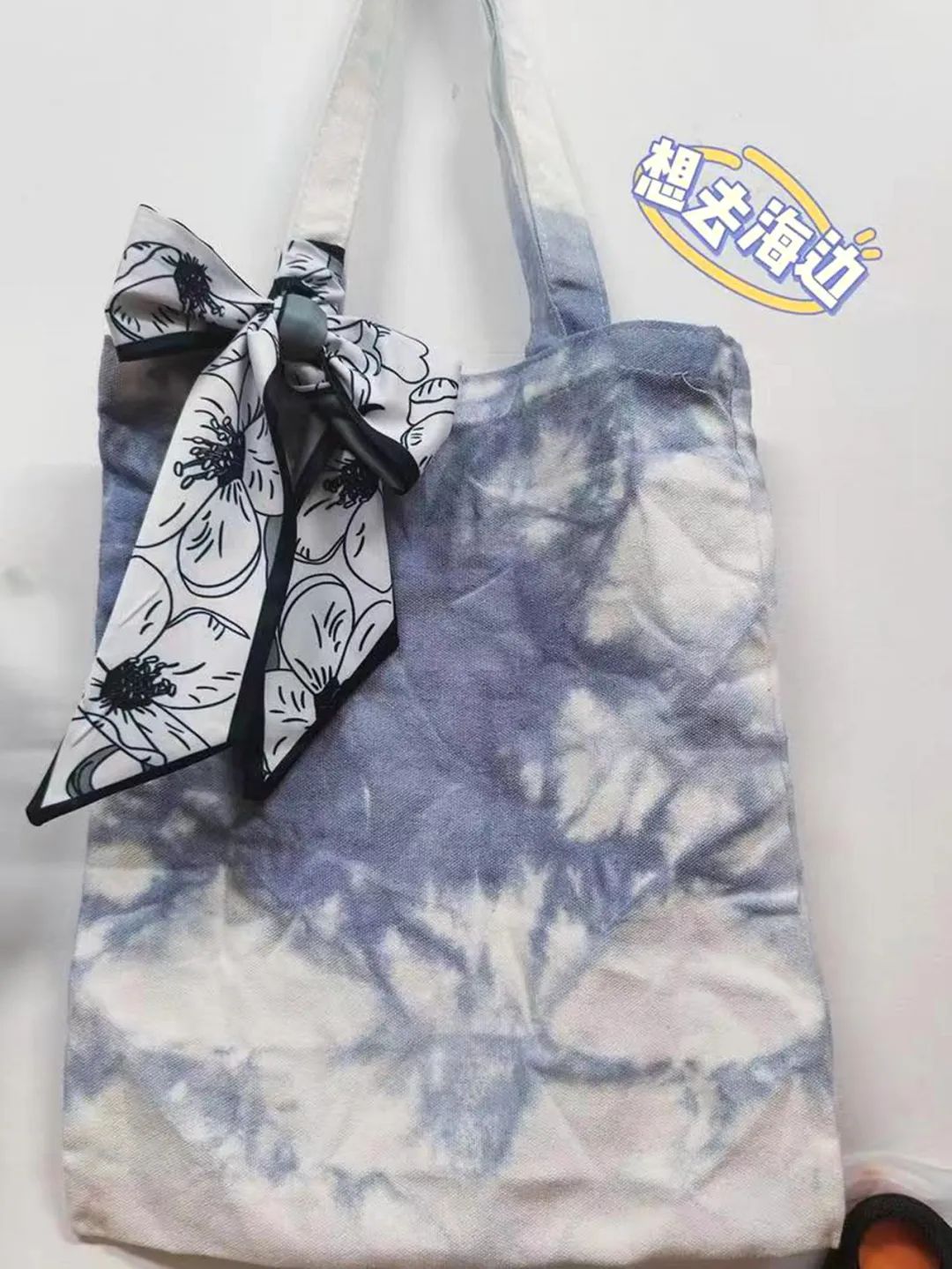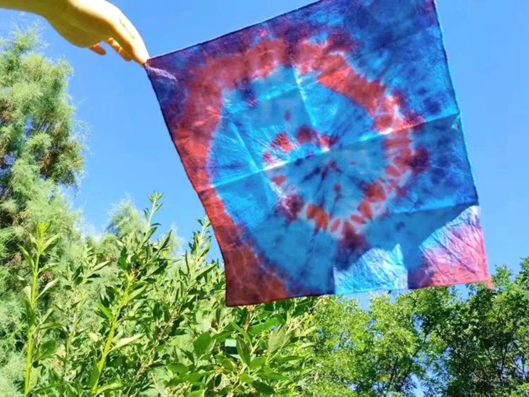 “扎染的工艺是较为简单且容易学习的。”马若琼说,“扎染的主要过程分为结扎和染色两个部分。总体来说,就是通过线、绳、或纱等一些工具,对这些织物进行扎、缝、缚、缀、夹等步骤,再进行染色。详细地说,有这样几个步骤:首先要对布料进行一定的处理。比如,退浆、精炼、漂白、熨平等;接下来便是扎结,扎结就是打结,方法有很多种。比如捆扎法、折叠扎法、利用针和线的卷针缝绞法等。第三步就是染色,染色完成后就是第四步———漂洗。漂洗完之后再熨烫,最后对它进行整理。正因为有了以上操作起来较为简易的制作步骤,扎染技术才能流传至今,深受老百姓喜爱。”