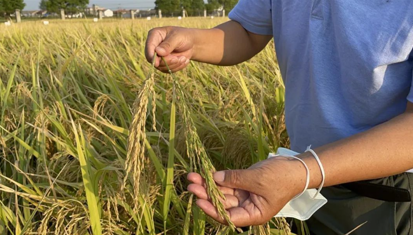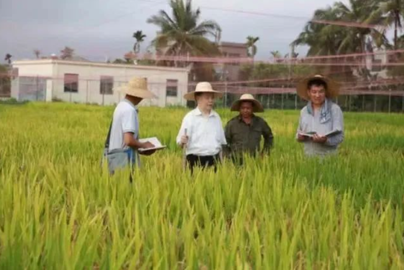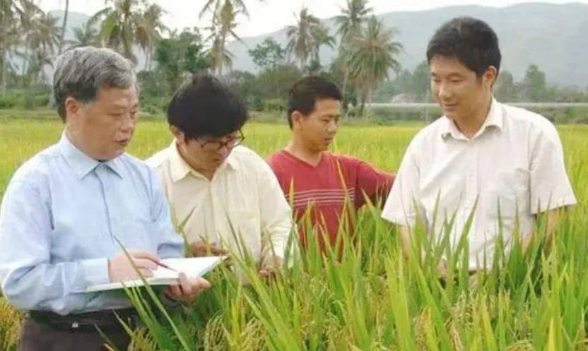 ▲朱英国(左二)、朱仁山(右一)查看育种情况
