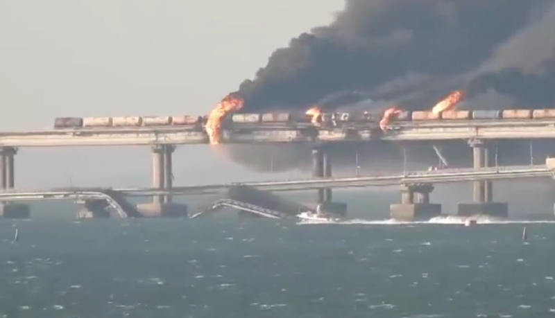 当地时间8日早上,克里米亚大桥公路桥上一辆卡车发生爆炸,导致与公路桥并行的铁路桥上一货运列车上七个油罐被点燃,公路桥部分路段受损,事故还造成3人死亡。对此俄方将其定性为针对“关键民用基础设施的恐怖袭击”。