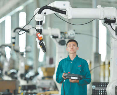河北省任丘市通过搭建科技创新平台,建设研发中心、技术研究院,持续深化产学研合作交流,推动企业转型升级。图为工作人员在生产车间调试机器人。苑立伟摄(影像中国)
