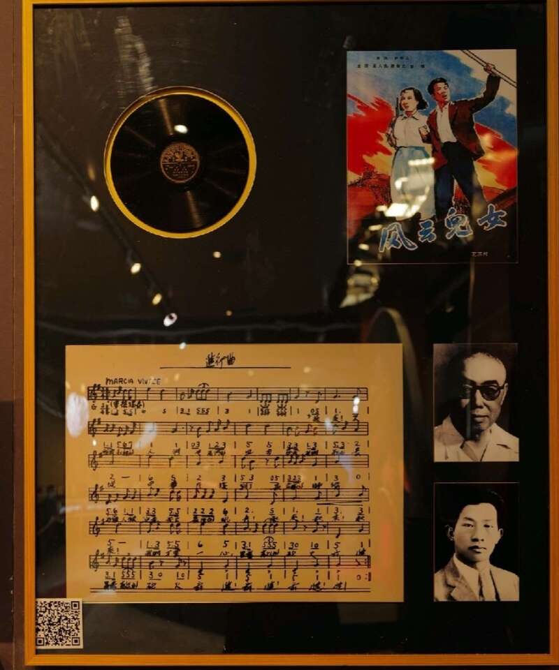 展览的另一大亮点展品是,由百代唱片公司于1935年5月9日录影棚录制完成的《义勇军进行曲》首版唱片。这首由田汉作词、聂耳作曲的歌曲,是电影《风云儿女》的主题歌,被称为中华民族解放的号角,1949年中华人民共和国成立后确定为国歌。