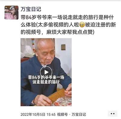 带爷爷去北京的视频在抖音收获了百万点赞,上了视频网站热门。人们被万宝的孝心、她和爷爷之间的真情所打动,很多年轻人在评论区或表示羡慕,或抒发遗憾,或分享带家中老人旅游的经历,或咨询带老人旅游的攻略。不少人开始意识到要多珍惜和长辈的时光,不愿让“子欲养而亲不待”变为永恒的遗憾。