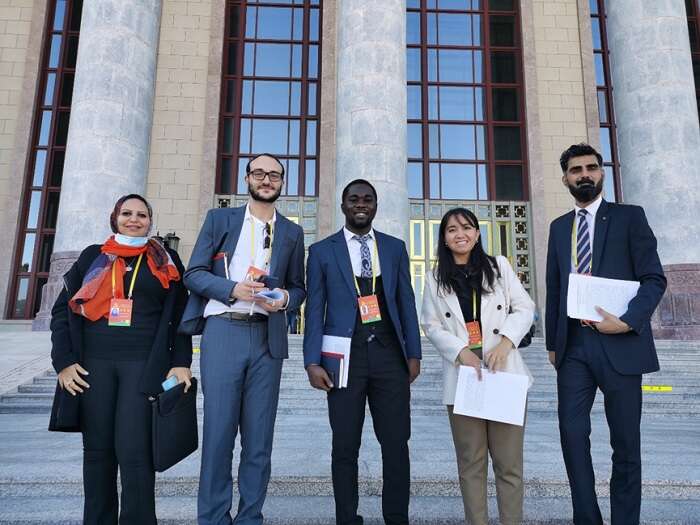 10月22日,中国共产党第二十次全国代表大会闭幕会结束后,拉曼库洛娃(右二)与多国记者在人民大会堂前合影。受访者供图