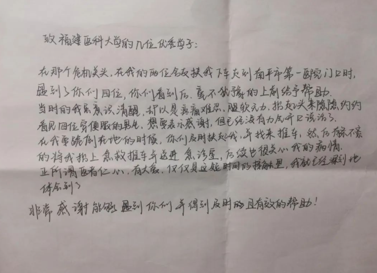 2022年10月25日,文怡霖(化名)来到福建医科大学附属南平第一医院,希望找到3天前为自己提供帮助的4名医学生,当面表达感谢。