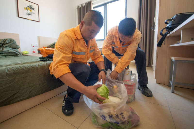 9月19日,看守员赵伟灯(左)与蔡金矿在寝室内准备值守期间的各类生活物资。