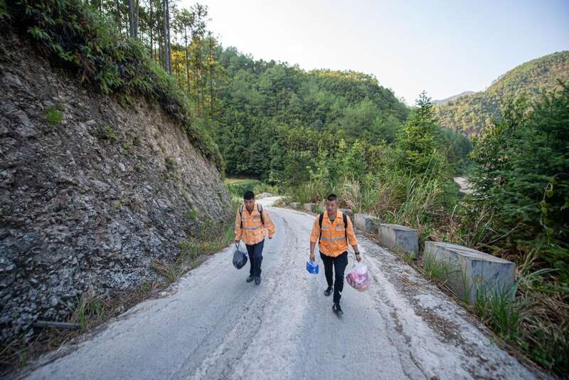 9月19日,看守员赵伟灯(右)与蔡金矿在前往赤岭隧道防洪值守点的山路上行走。