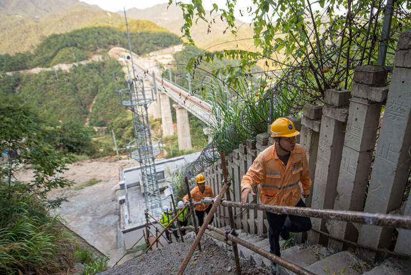 9月19日,看守员赵伟灯(右)与蔡金矿行走在通往赤岭隧道防洪值守点的便桥上。