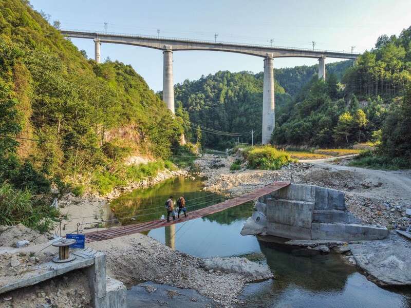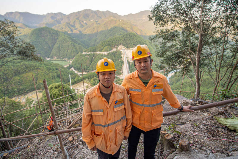 在群山、溪流和跨越山谷的铁路大桥搭建的背景幕布下,两名铁路工人摇摇晃晃行走在临时搭建的钢索吊桥上——原来的桥在汛期被山洪冲垮了。