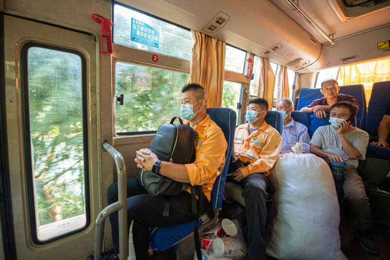 9月19日,看守员赵伟灯(左一)与蔡金矿(左二)乘坐乡村公交车前往赤岭隧道。