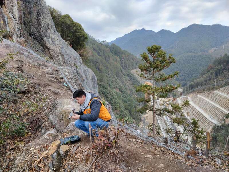 辛勤工作一周的另外两名看守员已经在防洪点简易小屋的门口翘首以盼了。赵伟灯与蔡金矿抵达的第一件事就是与他们完成工作的交接,随后戴上安全帽,带上工具包,沿着脚手架搭成的便梯,继续向赤岭隧道山顶存在地质灾害隐患的点位攀登。为了确保能够拍到最理想的画面,我第一个攀上便梯,迅速爬到一处可供停留驻足的平台,连续按下快门。抵达山顶之后,我继续与赵伟灯一起,手脚并用地攀过一处悬崖边的隘道,记录下他检查地质灾害隐患点位的影像。山顶的地势狭窄却毫无遮拦,脚下就是延绵的山丘和那条贯穿其中的钢铁巨龙,我邀请赵伟灯与蔡金矿在他们工作、坚守、奋斗的山顶合影留念。