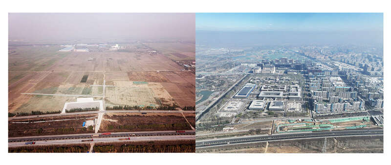 ↑ 这两张拼版照片显示的2017年(图左)与2022年(图右)拍摄的雄安新区容东片区对比。