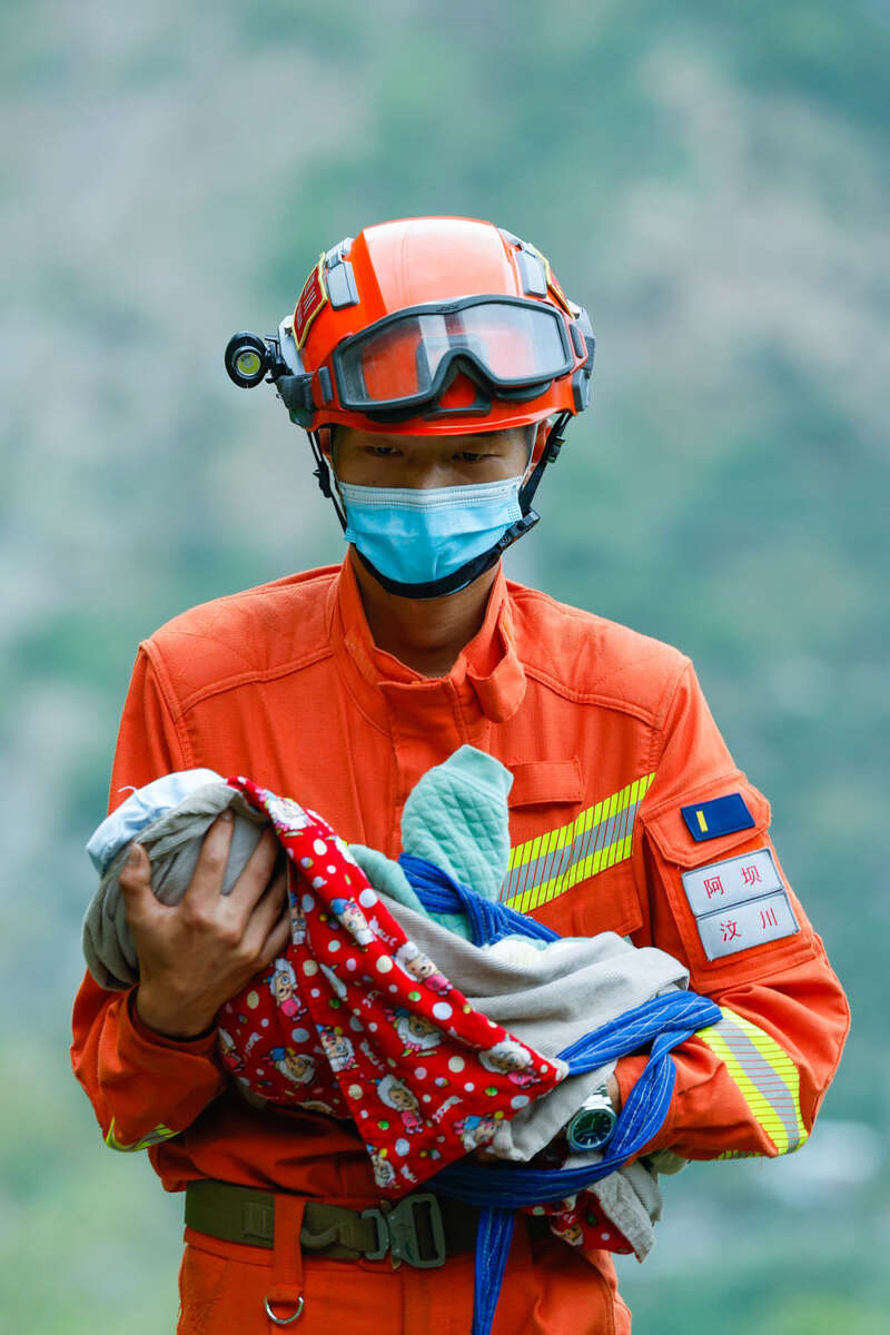 ↑ 2022年9月6日,阿坝森林消防支队汶川大队队员张自立抱着一名从湾东村疏散出来的两个月大的婴儿。