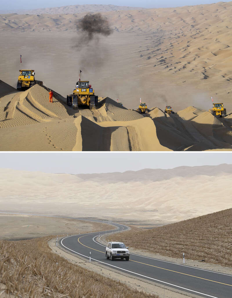 ↑ 上图为2020年5月16日拍摄的尉犁至且末沙漠公路施工现场(新华社记者胡虎虎摄);下图为2022年6月25日在尉犁至且末沙漠公路同一路段拍摄的工作车辆在路面行驶(新华社记者李响摄)。