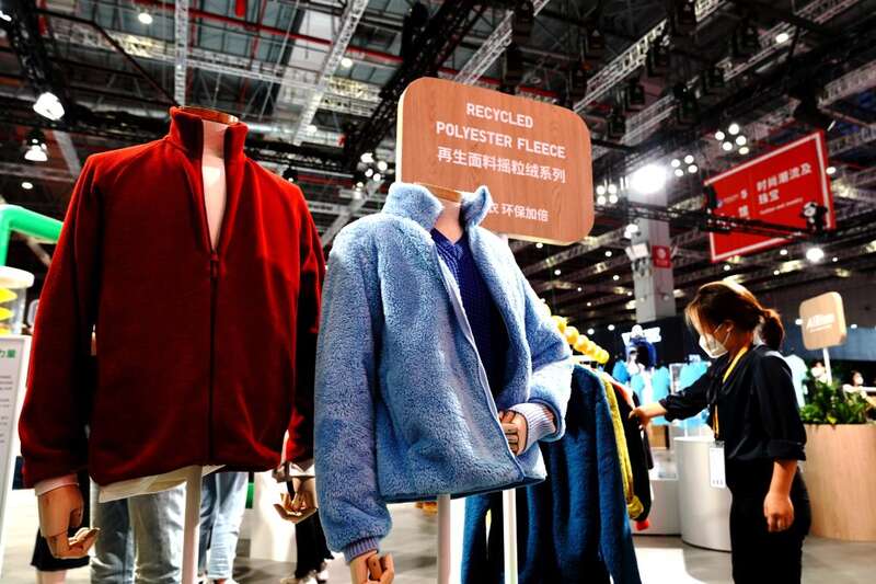 在优衣库展台,红、蓝、绿、黄……色彩明艳的摇粒绒服装格外惹眼。有趣的是,这种触感柔软、被时下年轻人称为“过冬神器”的面料来自再生材料。