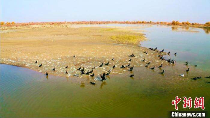 在沙漠、胡杨、湖泊形成的新疆尉犁县罗布淖尔国家湿地公园里,鸟儿成群结伴,时而在沙滩上晒太阳、时而游弋在湖中央觅食、时而又飞上了金黄色的胡杨顶端,悠闲自得地享受着阳光。