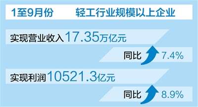 中国轻工业联合会近日公布前三季度我国轻工业经济运行情况。数据显示,1至9月份,轻工行业规模以上企业实现营业收入17.35万亿元,同比增长7.4%;轻工行业利润增速逐月上行,盈利持续改善,1至9月份,轻工行业规模以上企业实现利润10521.3亿元,同比增长8.9%,增速较前8月加快1.5个百分点。