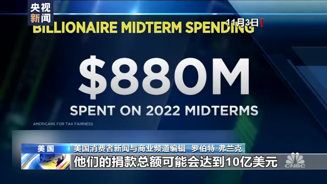 美国消费者新闻与商业频道编辑 罗伯特·弗兰克:亿万富翁们在中期选举中的捐款总额达到了创纪录的8.8亿美元,比2018年增长了44%。到了周二(11月8日投票当天),他们的捐款总额可能会达到10亿美元。这些富豪们给共和党和民主党都捐款,但是更偏向共和党。资金比大约是3(共和党):2(民主党),政治行动委员会(PACs)每花10美元,其中就有1美元来自亿万富翁。