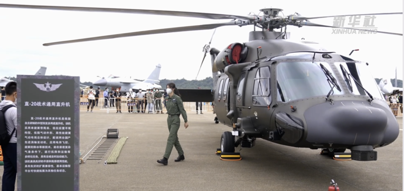 在第十四届中国国际航空航天博览会上,年仅23岁的直-20女飞行员徐枫灿在室外静态展区承担直-20机型的解说任务。