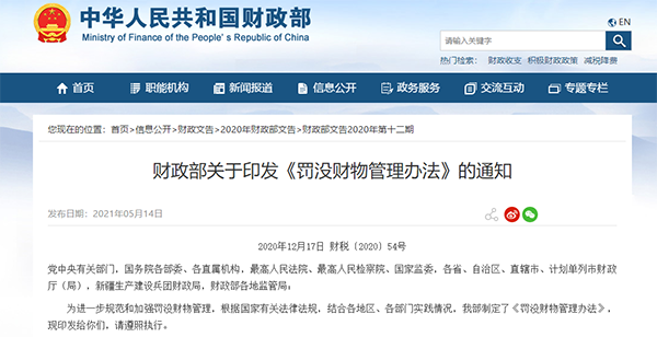 2021年1月1日起,由财政部制定的《罚没财物管理办法》(以下简称《办法》)开始实施。