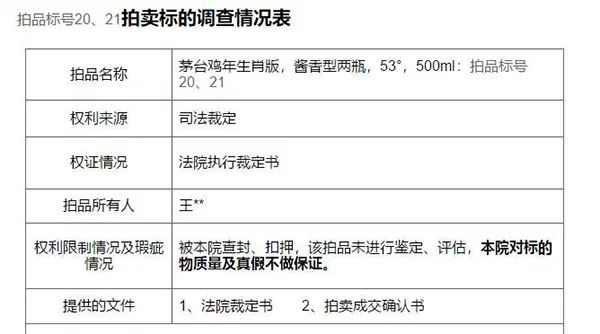 博望区法院发布的标的物介绍显示,这批酒品系被该院查封、扣押,“标的物未进行鉴定和估价,请竞拍人在拍卖前必须仔细审查拍卖标的物,调查是否存在瑕疵,认真研究查看所竞买标的物的实际情况,实地看样,竞拍人一旦做出竞买决定,即表明已完全了解,并接受标的物的现状和一切已知与未知的瑕疵,本院对标的物质量及真假不做保证。”