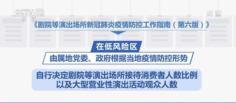在低风险区,由属地党委、政府根据当地疫情防控形势,自行决定剧院等演出场所接待消费者人数比例以及大型营业性演出活动观众人数。在高风险区,暂缓举办营业性演出活动。
